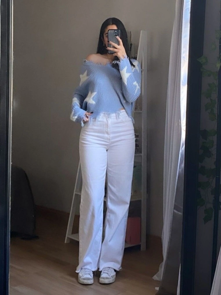 This winter outfit brings together a soft periwinkle off-shoulder sweater with small star details and clean white denim for a cozy yet stylish look. The off-shoulder design adds a gentle touch of elegance while still feeling comfortable for cold days.