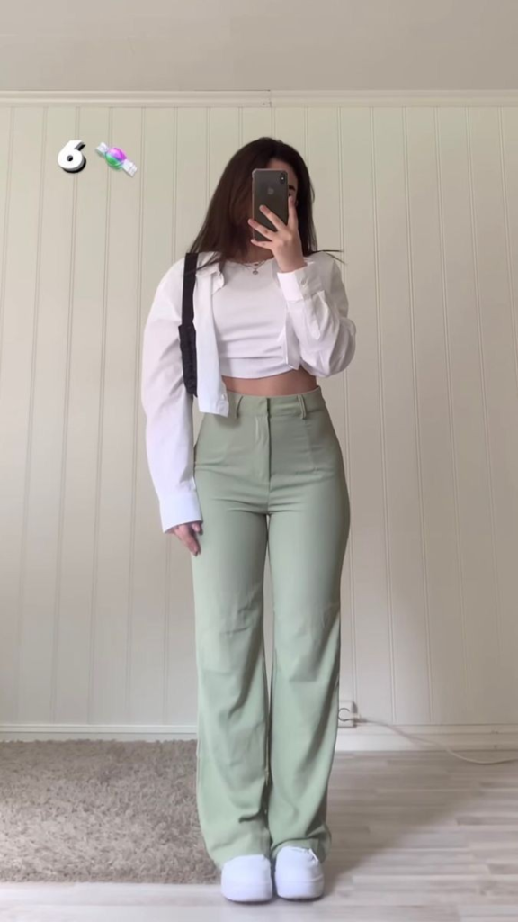 This outfit brings together a sage green blazer, a white crop top, and cream wide-leg trousers to create a look that feels polished but still easy to wear for school. The calm, neutral colors help you feel confident and put-together all day.