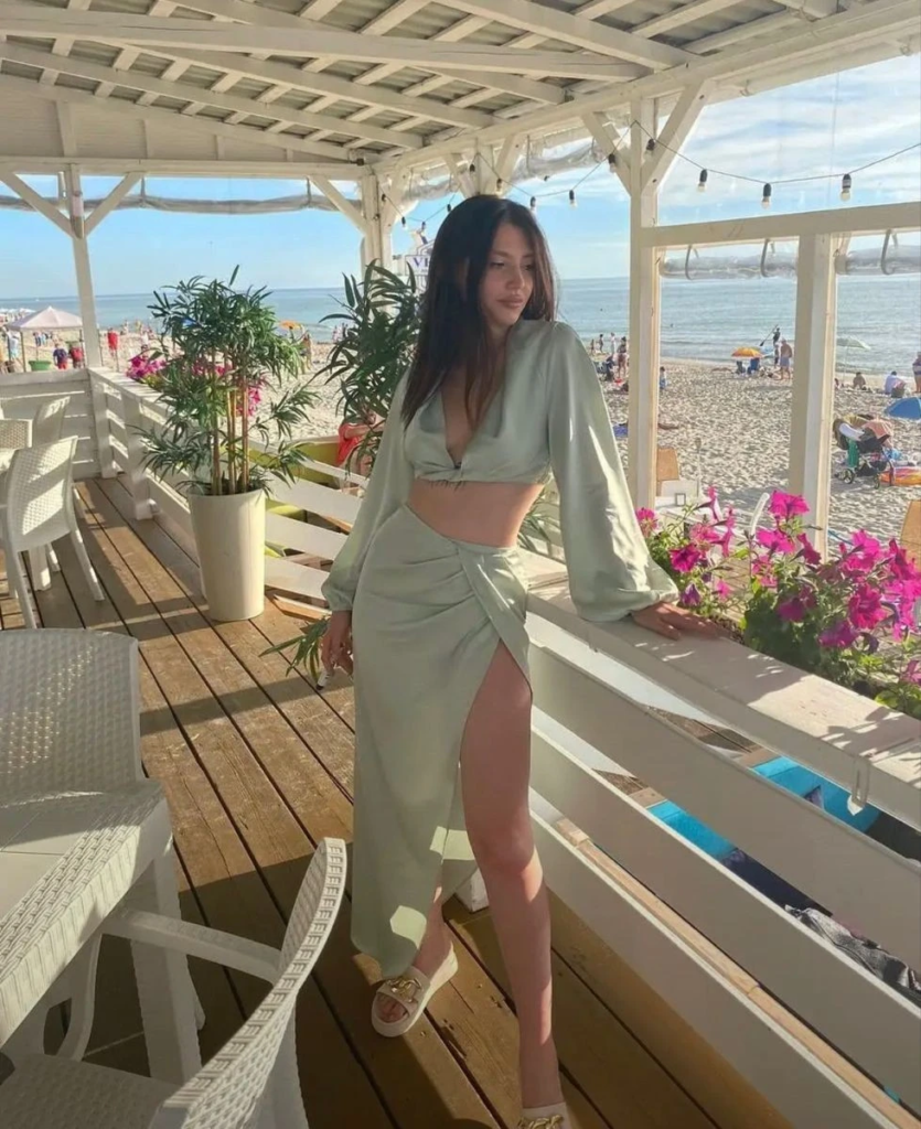 A soft sage green crop top with a high-waisted skirt offers effortless elegance. Neutral slides and simple jewelry make this outfit subtle yet chic. Ideal for transitioning from the sand to casual dinner spots.