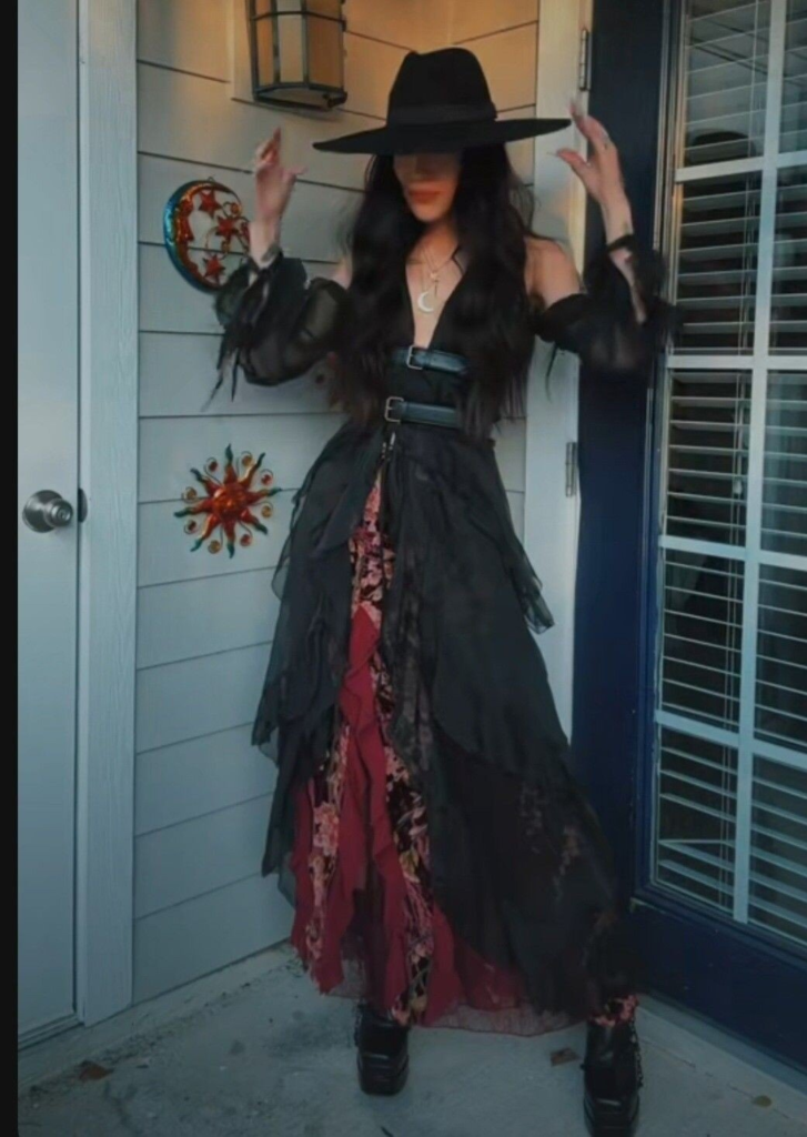 A gold belt buckle and black boots add structure and edge. This look blends dark gothic drama with romantic, free-spirited elements, showing how boho goth style balances both toughness and grace through thoughtful layering and colors.